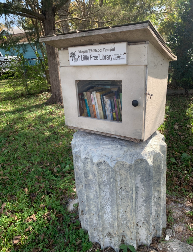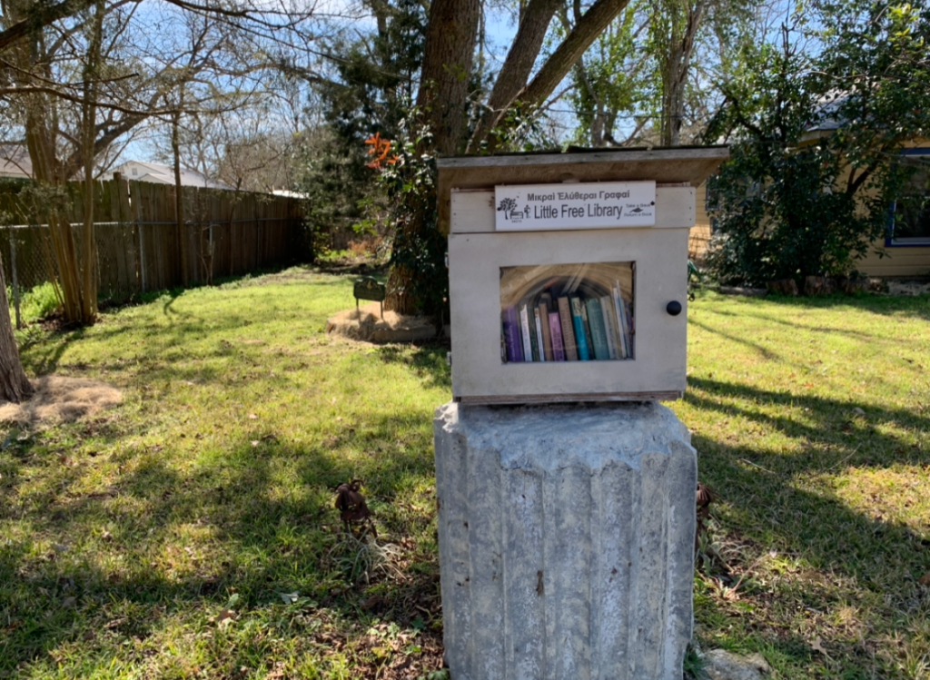 Another important aspect of the library is the plaque that rests at the head of the build. Each Little Free Library has a charter sign with that library’s charter number (indicating that it is a registered Little Free Library), but this is the first sign I’ve seen that has this inscription in a different language. A quick answer from Dr. Briney confirmed that the inscription is a Greek translation of “Little Free Library.” Each registered plaque also has the Little Free Library motto inscribed, “Take a Book, Return a Book,” though the Little Free Library website has changed it to “Share a Book” instead (probably to insinuate that you don’t actually have to return the book you took from the library). Either way, both mottos encourage people to participate in the community’s library in some way or another.