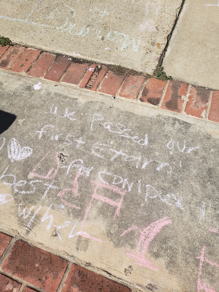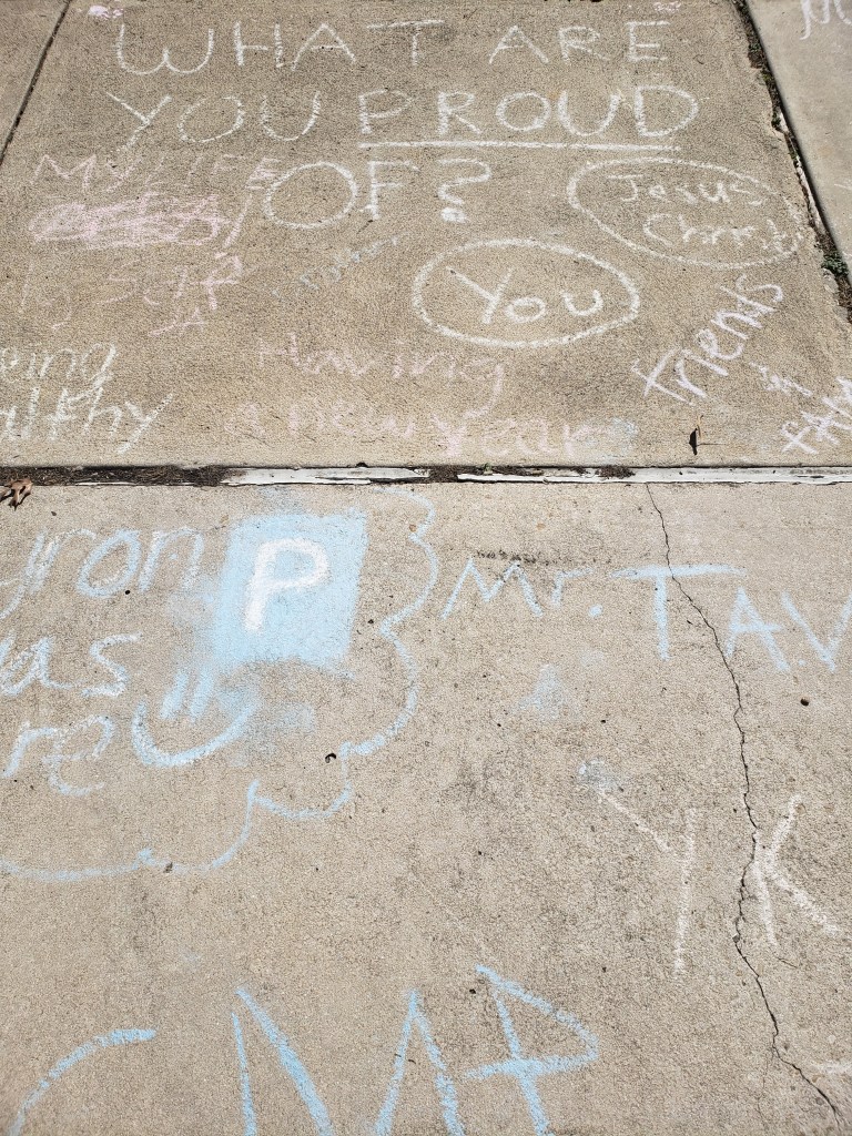 In the past couple of weeks, one of my little sources of hope and delight has been the chalk messages and drawings outside the ASC. While the prompt was originally “what are you proud of?” students have also been using the area to draw, write positive messages, and celebrate milestones.